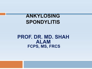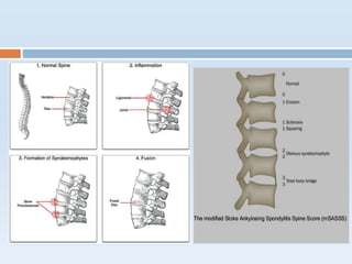This document provides information on ankylosing spondylitis (AS), a chronic inflammatory disease primarily affecting the spine and sacroiliac joints. Key points include:
