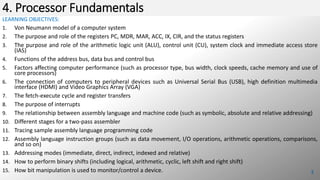 The document outlines the CIE 9618 syllabus for GCE AS Level, focusing on CPU architecture, assembly language, and processor fundamentals. It details components, functions, and connections of CPUs, including the von Neumann architecture, system buses, and data handling. Key terms, performance factors, and the fetch-execute cycle are also discussed, emphasizing their roles in computer operations and interactions with peripheral devices.