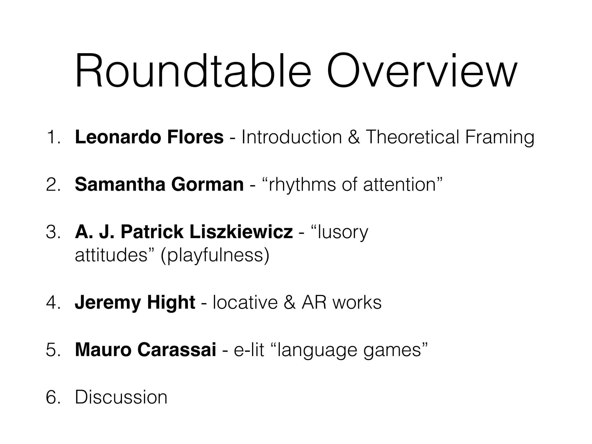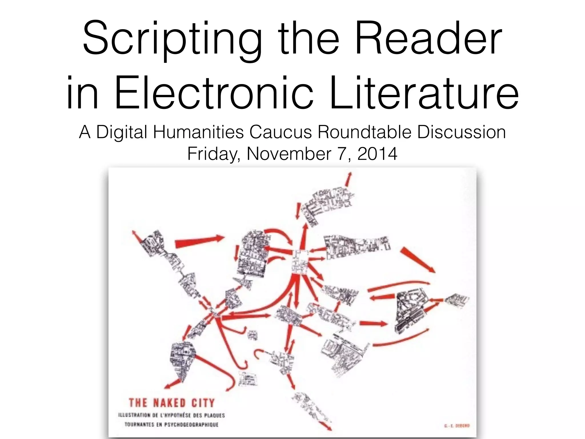 This document outlines a roundtable discussion on electronic literature, focusing on how it differs from e-books and its experimental practices. Key topics include designing reader interaction, the role of fun in engagement, and the influence of virtual environments on the reading experience. The discussion references various theoretical frameworks, including cybertext and psychogeography, to explore these themes.