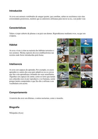 As aves sonanimais vertebrados de sangue quente, que camiñan, saltan ou suxéitanse coas súas