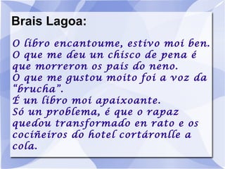 Brais Lagoa: Olibro encantoume, estivo moi ben. O que me deu un chisco de pena é que morreron os pais do neno. O que me gustou moito foi a voz da “brucha”. É un libro moi apaixoante. Só un problema, é que o rapaz quedou transformado en rato e os cociñeiros do hotel cortáronlle a cola.