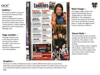 This document analyzes the design elements of a music magazine contents page and double page spread (DPS). It discusses the use of prominent band/artist names on the contents page followed by brief article summaries. Dark colors like black and red are used for text against a white background for readability. Larger images feature recognizable stars to attract audiences. Additional sections use different eye-catching fonts. Pull quotes and drop caps are used to draw readers in. Graphics match related articles in tone. Page numbers are distinguished from body text. Questions in interviews are highlighted for emphasis. Consistency is created through matching typography and layouts to article subjects. Centered pull quotes in different colors also attract readers.