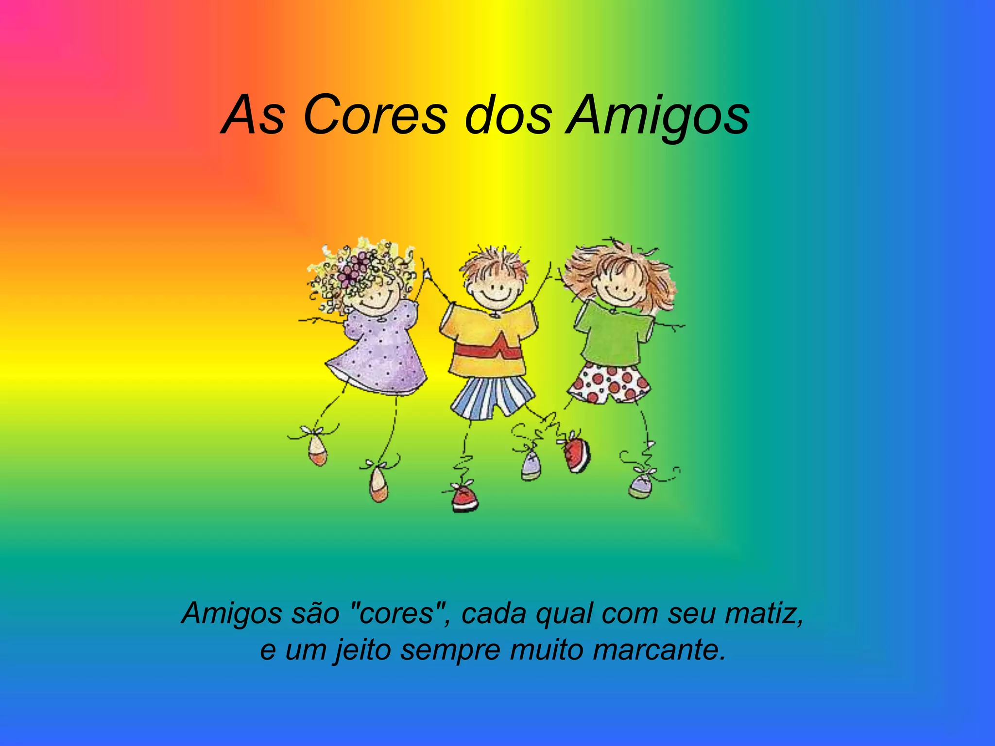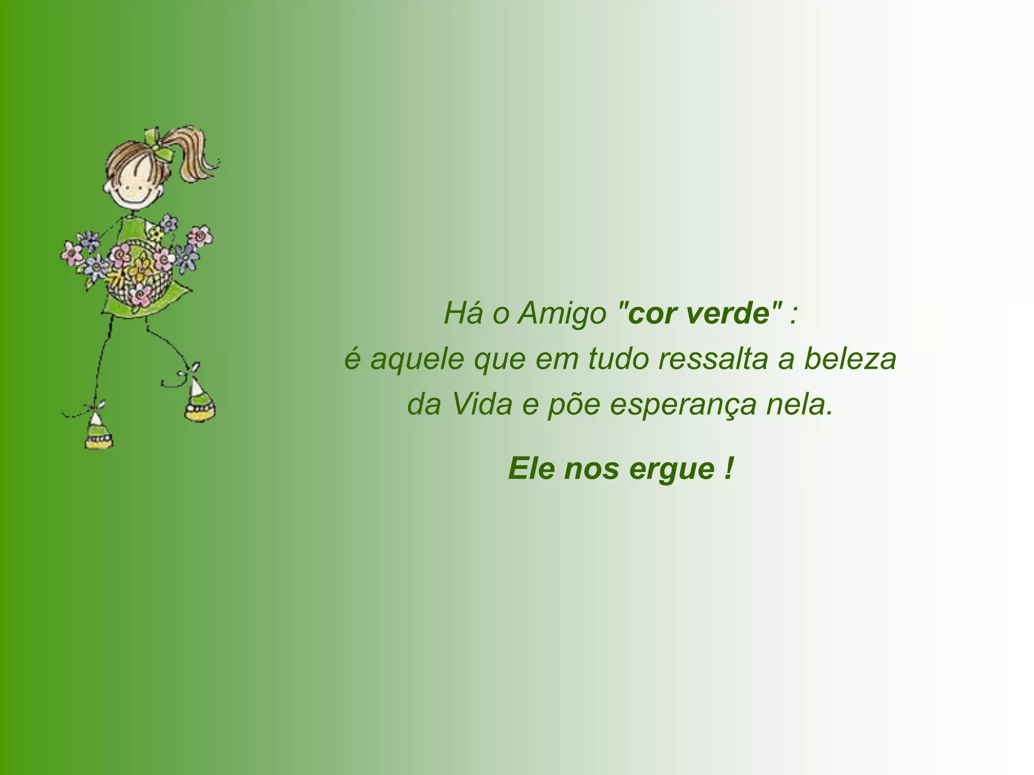 O documento descreve os diferentes tipos de amigos comparando-os às cores do arco-íris, com cada cor representando características e qualidades únicas. Os amigos verdes trazem esperança e beleza, os azuis trazem paz e serenidade, e os amarelos aquecem e fazem sorrir. Cada cor de amigo ensina algo diferente sobre a vida. Quando reunidos, eles formam um arco-íris de amor.