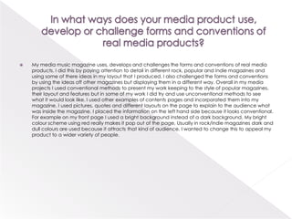 The document summarizes the student's media music magazine project. It discusses how the magazine both uses conventions from real music magazines as well as challenges some conventions. It targeted multiple music genres and social groups to attract more buyers. The magazine would be distributed in stores like supermarkets, bookstores, and record shops. The target audience is teenagers and young adults interested in various types of popular music. Images and stories were used to attract this audience. The student learned important skills in photography and using Photoshop through developing this project.
