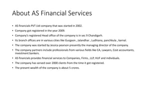 AS Financials Pvt Ltd, founded in 2002 and registered in 2009, is headquartered in Chandigarh with branches in several cities. The company provides a wide range of financial services and has served over 2,000 clients, boasting a wealth of approximately 5 crores and profits of about 1.5 crores last year. The firm employs over 95 staff and has a strong team of partnered professionals, including accountants and lawyers.
