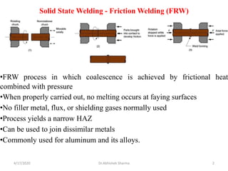 The document discusses friction stir welding (FSW), a solid-state welding process. FSW involves a rotating cylindrical shoulder tool that is plunged into two abutting metal pieces. Frictional heat and pressure generated by the tool's pin and shoulder forge the plasticized metal together. Key advantages of FSW include a solid-state process that avoids defects of fusion welding and the ability to join dissimilar metals. The document outlines the FSW process, microstructure analysis of welds, tool design considerations, applications, advantages, and challenges of the technique.