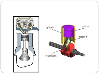 This document provides an introduction to internal combustion engines. It covers topics such as the classification of I.C. engines by fuel, ignition method, number of strokes, cooling system, and more. The four strokes of a diesel engine operation are described. The differences between direct and indirect diesel injection are outlined. Finally, the basic constructional details of engine components like the cylinder, piston, connecting rod, crankshaft, and others are explained.