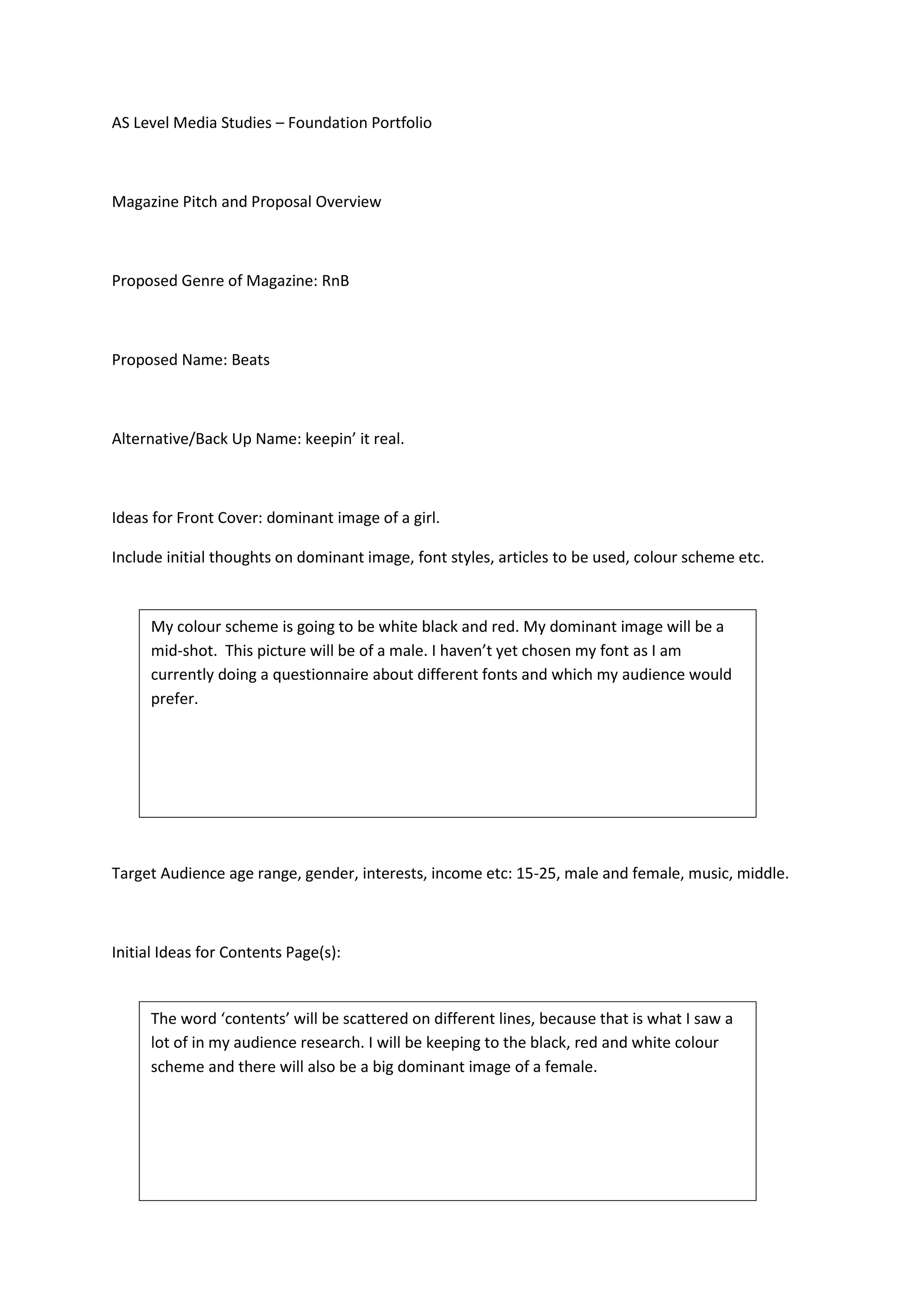The document provides an overview of a proposed RnB magazine called "Beats". Key details include: