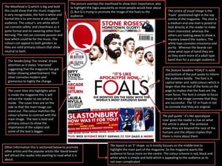 The document provides details about the layout, design elements, and intended messaging of various magazine covers and pages. It analyzes aspects like mastheads, fonts, color schemes, images, pull quotes, and section headings to understand how they are used to target specific audiences and convey information. For example, a Q magazine cover uses a bold masthead, white font, and primary colors to seem recognizable and appeal to both genders. The layout focuses attention on the central image of the band Foals to highlight them as the main feature.