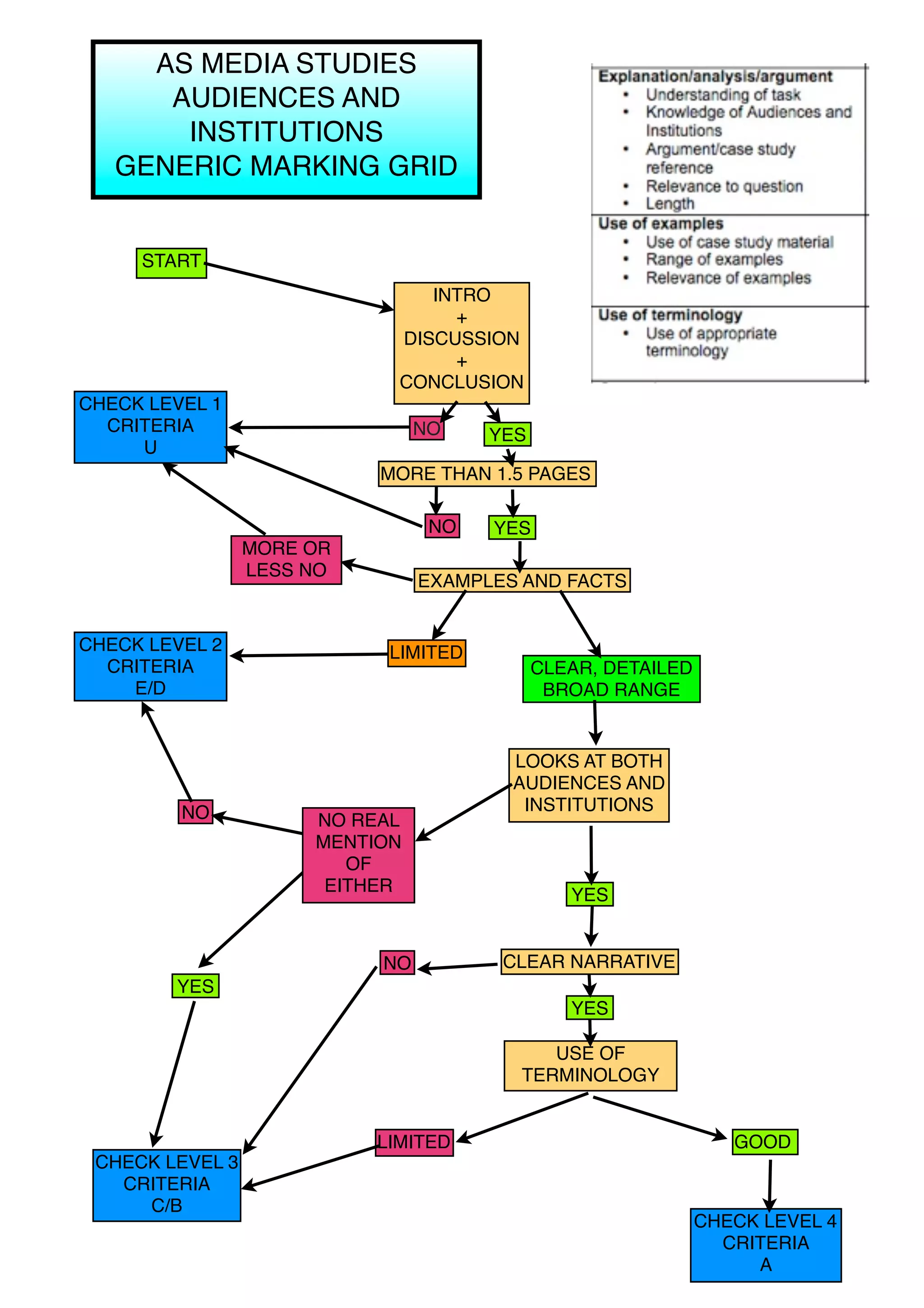 This document appears to be a marking grid for a media studies assignment focusing on audiences and institutions. It provides criteria for four levels to assess introductions, discussions, conclusions, use of examples, addressing of key topics, narratives, terminology, and overall quality. Meeting the thresholds for the criteria across the levels would result in a high mark or grade for the assignment.