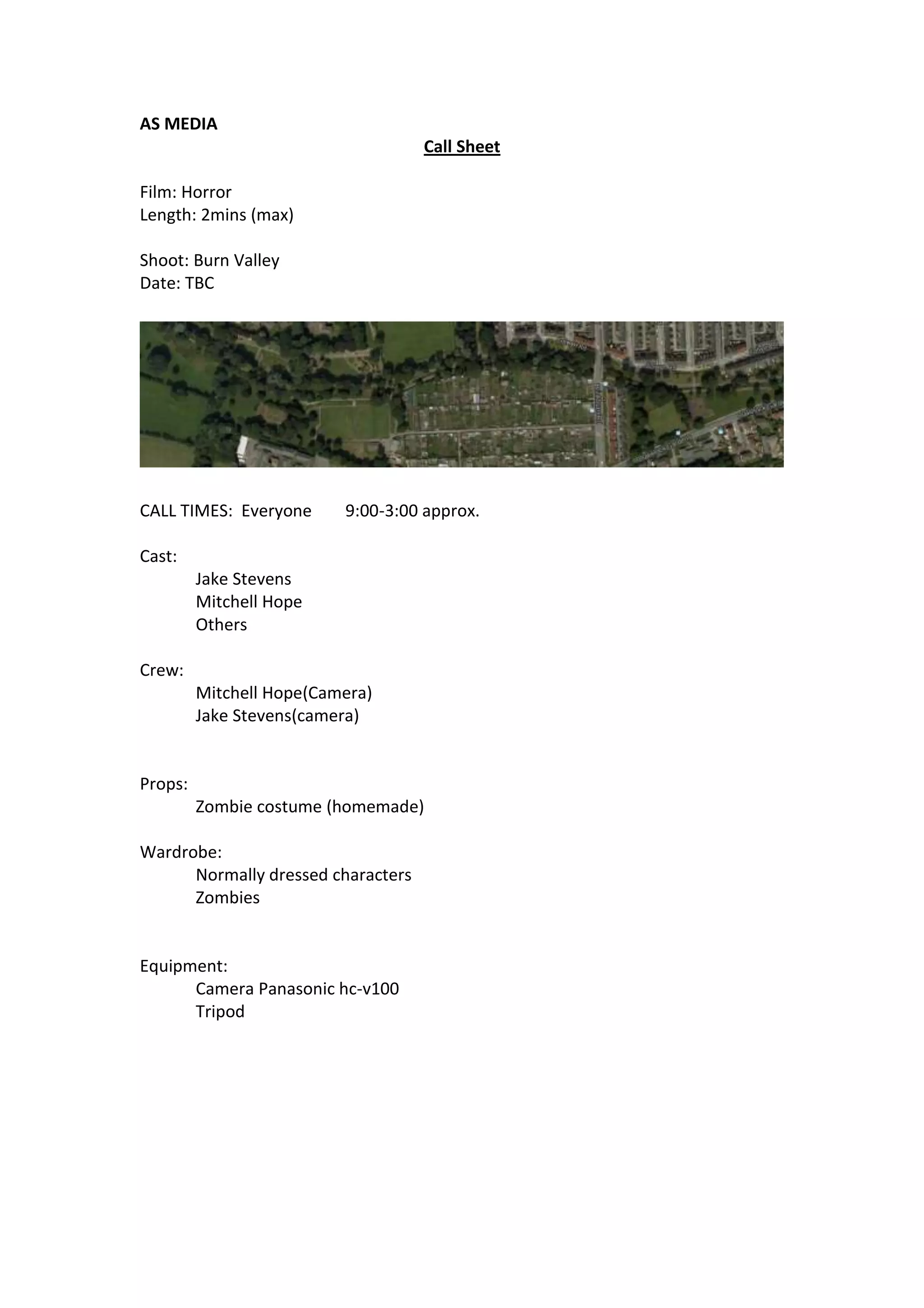 The document provides a call sheet for a 2 minute horror film shoot in Burn Valley. It lists the cast including Jake Stevens and Mitchell Hope who will also operate cameras. Props include a homemade zombie costume and wardrobe includes normally dressed characters and zombies. Equipment is a Panasonic hc-v100 camera and tripod.