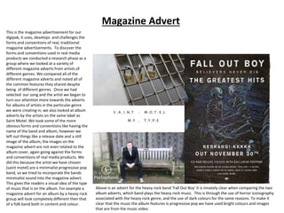This document summarizes an album advertisement, digipak, and music video created for a class project.