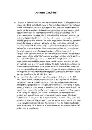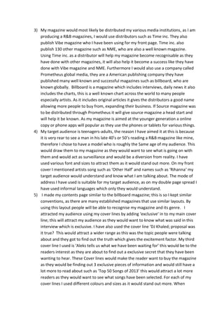 My music magazine targets 16-30 year olds and features a smiling black male model on the cover wearing trendy clothing, departing from the more serious poses typically found on other magazines. The layout and design was influenced by Vibe magazine, including placing the model's head over the magazine name on the cover. The magazine would likely be distributed by major companies like Time Inc. and Prometheus Global Media to reach a wide audience across different platforms and expand its recognition. Through constructing the magazine, I learned valuable skills in photography, image editing, layout, and formatting for different platforms to create a professional product.