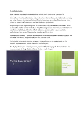 Microsoft Word, PowerPoint, and Blogger allowed me to create and present my work professionally. While it took some time to learn Blogger, I was able to upload posts on my own. Photoshop enabled me to design my magazine and edit photos. Technological convergence through classroom computers allowed me to research online, take pictures, and incorporate them into my projects. This demonstrates how one device can be used to research, create, and distribute work easily and cheaply.