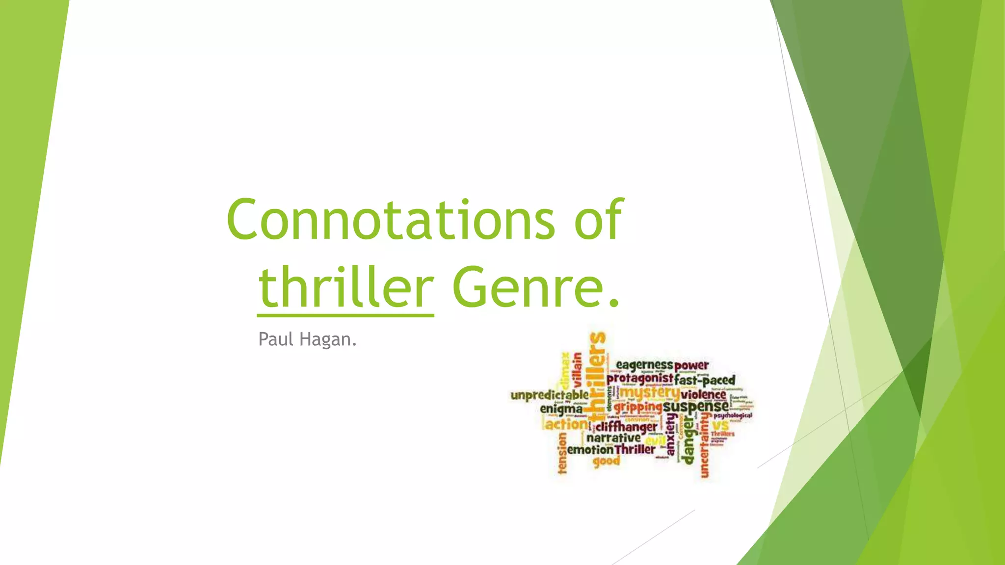 The document discusses the thriller genre and the conventions of action thriller films. It provides examples of popular thriller films and their plots. It notes that thrillers are meant to keep audiences guessing and on edge through tension, plot twists and a climax where the protagonist succeeds. It discusses the importance of dark, mysterious music in soundtracks to build suspense. Finally, it outlines some common characteristics of action thrillers like Taken, including stereotypical characters like a male protagonist on a mission and antagonists, as well as props like weapons and destroyed vehicles.