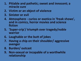 The document discusses various stereotypical portrayals of disabled people in media, including as objects of pity, violence, ridicule, or burdens. It outlines theories of disability including the moral, personal tragedy, medical, and social models. Examples are provided of both negative portrayals that reinforce stereotypes, like in the film Hannibal, and more positive representations, like the movie Finding Nemo. The document argues that media often relies on stereotypes and emphasizes impairments rather than showing disabled people as fully participating members of society.