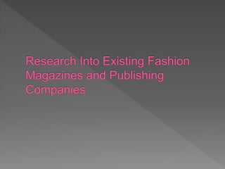 The document discusses a student's media studies portfolio task to research existing magazine production companies that publish fashion magazines. The student aims to learn about the demographics targeted, media platforms used, examples of cross-media promotion, and production methods to help inform their own fashion magazine design. By analyzing existing companies, the student hopes to create a successful fashion magazine that fits within the industry.