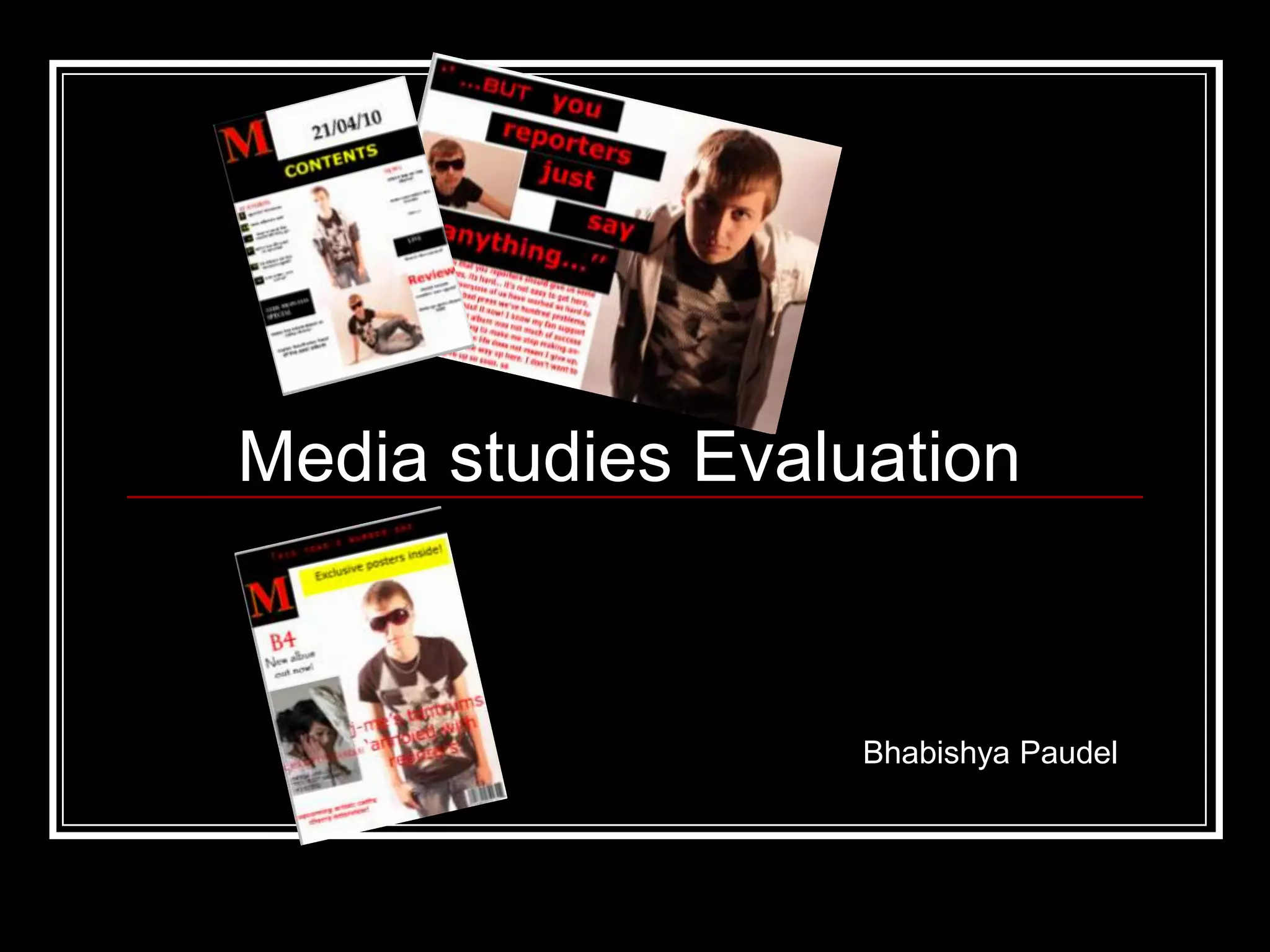 This document summarizes the media studies evaluation of a magazine product. It discusses how the magazine both uses conventions of real magazines, such as including a masthead, but also challenges conventions with its own style. The magazine represents young pop music listeners aged 15-19. It would be distributed in music shops, supermarkets, and online. The document discusses how the magazine attracts its target audience through using simple language, featuring a young model, and including interesting gossip stories.