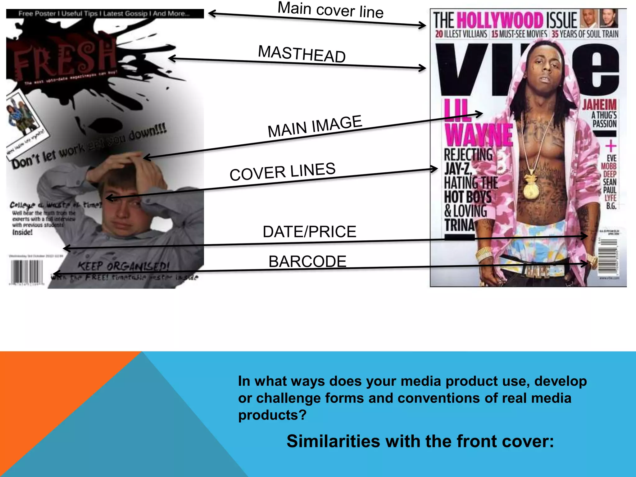 Specifically, the student's magazine cover shares some similarities with Vibe magazine, such as using a main image and promotions. However, it also has differences, like the model looking away distressed rather than with attitude. Technologically, the student used a camera for photos, Moodle for resources, Photoshop to design the cover, and InDesign to assemble the magazine. Key skills learned in Photoshop included removing backgrounds, adding shapes, text effects, and more.