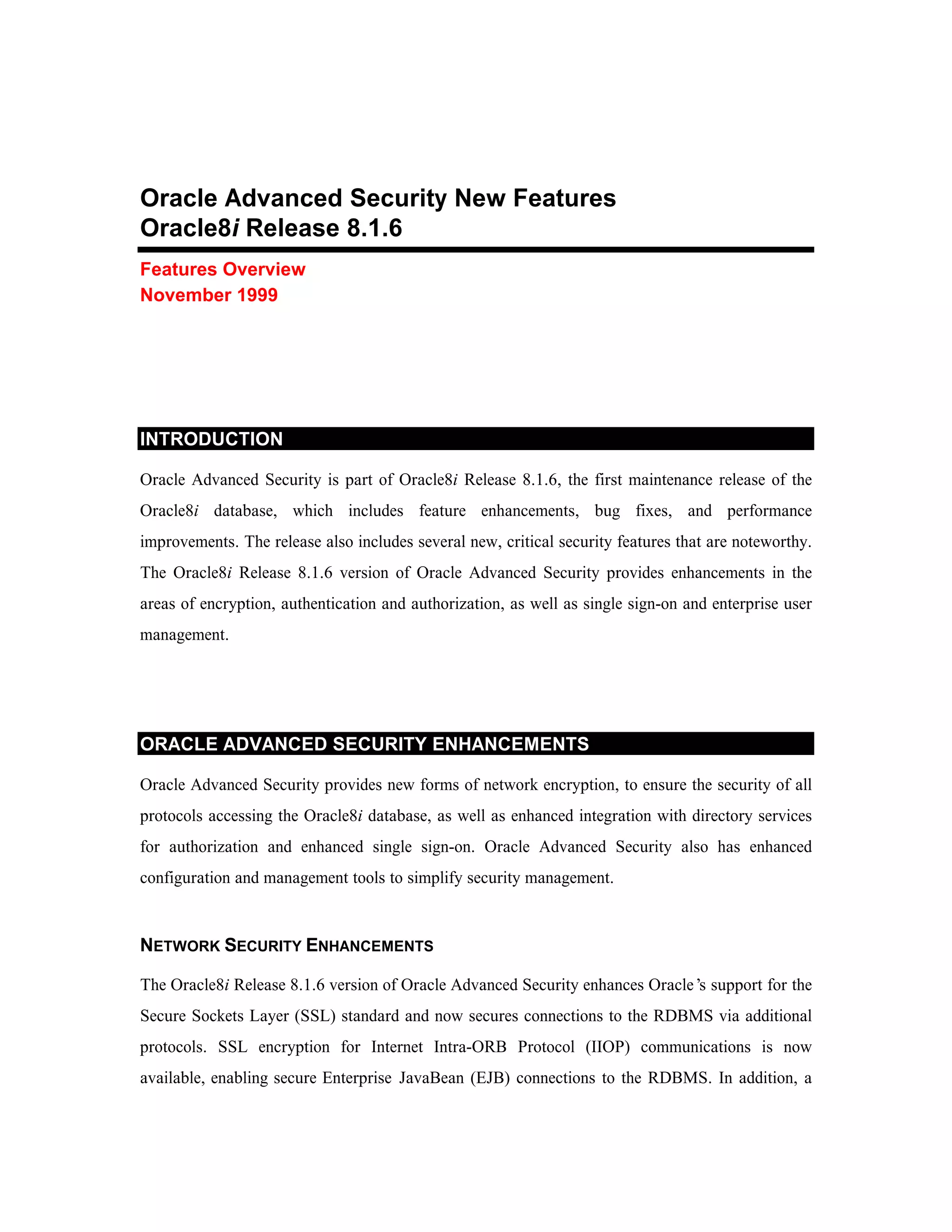 The document summarizes new security features in Oracle Advanced Security for Oracle8i Release 8.1.6, including enhancements to encryption, authentication, authorization, and single sign-on. It provides stronger encryption algorithms, secures additional protocols like IIOP and JDBC, and adds support for SSL-based single sign-on and integration with directory services and PKI solutions like Entrust for centralized user management across databases.
