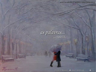 rreesseerrvvaaddooss 22001144 aaccaarriinnhhaa--mmee nnaass ppaallaavvrraass ddoocceess,, ttuuaass,, ssiilleenncciioossaass nnooss ggeessttooss qquuee vvaaiiss mmoossttrraannddoo qquuaannddoo ppaassssaass ddeevvaaggaarr nnuumm aaffaaggoo qquuaassee iinnttooccáávveell,, ssuussppiirraass ddeevvaaggaarr ee mmuuddaass oo oollhhaarr ccoommoo ffuuggiinnddoo ddaa eessccuurriiddããoo,, pprrooccuurraass aa lluuzz qquuee ttee aalluummiiee aa ppaallaavvrraa aa sseegguuiirr aa qquuee iirráá ttee ttooccaarr,, ddeevvaaggaarr,, ssuurrggee ee aappaarreeccee eemm ffrreennttee ddoo tteeuu oollhhaarr,, ttooccaass ee ddeesslliizzaass ccoomm aass lleettrraass,, cchhoorraannddoo aa ffeelliicciiddaaddee ppoorr aass ppooddeerreess tteerr ttããoo ppeerrttoo ee ttããoo lloonnggee,, ccoommoo ssee oo mmuunnddoo ffoossssee eessttaannqquuee nnaa ssuuaa ccoonnjjuuggaaççããoo,, ccoommoo ssee aass ggrraammááttiiccaass bbaaiillaasssseemm nnuumm ppaassssoo úúnniiccoo ccoomm aass eenncciiccllooppééddiiaass ddee ttooddoo oo mmuunnddoo,, ee oo ccoossmmooss ssee ccoonnffiigguurraassssee ddee nnoovvoo nnoo mmeessmmoo eessppaaççoo,, oonnddee hhaabbiittaammooss ooss nnoossssooss mmeeddooss ee aass nnoossssaass cceerrtteezzaass,, ee ttuuddoo éé ppoossssíívveell nnaa iimmppoossssiibbiilliiddaaddee aattéé ddee oo mmoommeennttoo eexxiissttiirr,, eessppaaççoo nnoossssoo ee nnoo ccaarriinnhhoo qquuee tteemmooss ppoorr eellaass...... aass ppaallaavvrraass.. ,,,,,,1133oouutt1144,,,, .. O Christina Nguyen--✿_Oppeenn AArrttGGrroouupp____________✿