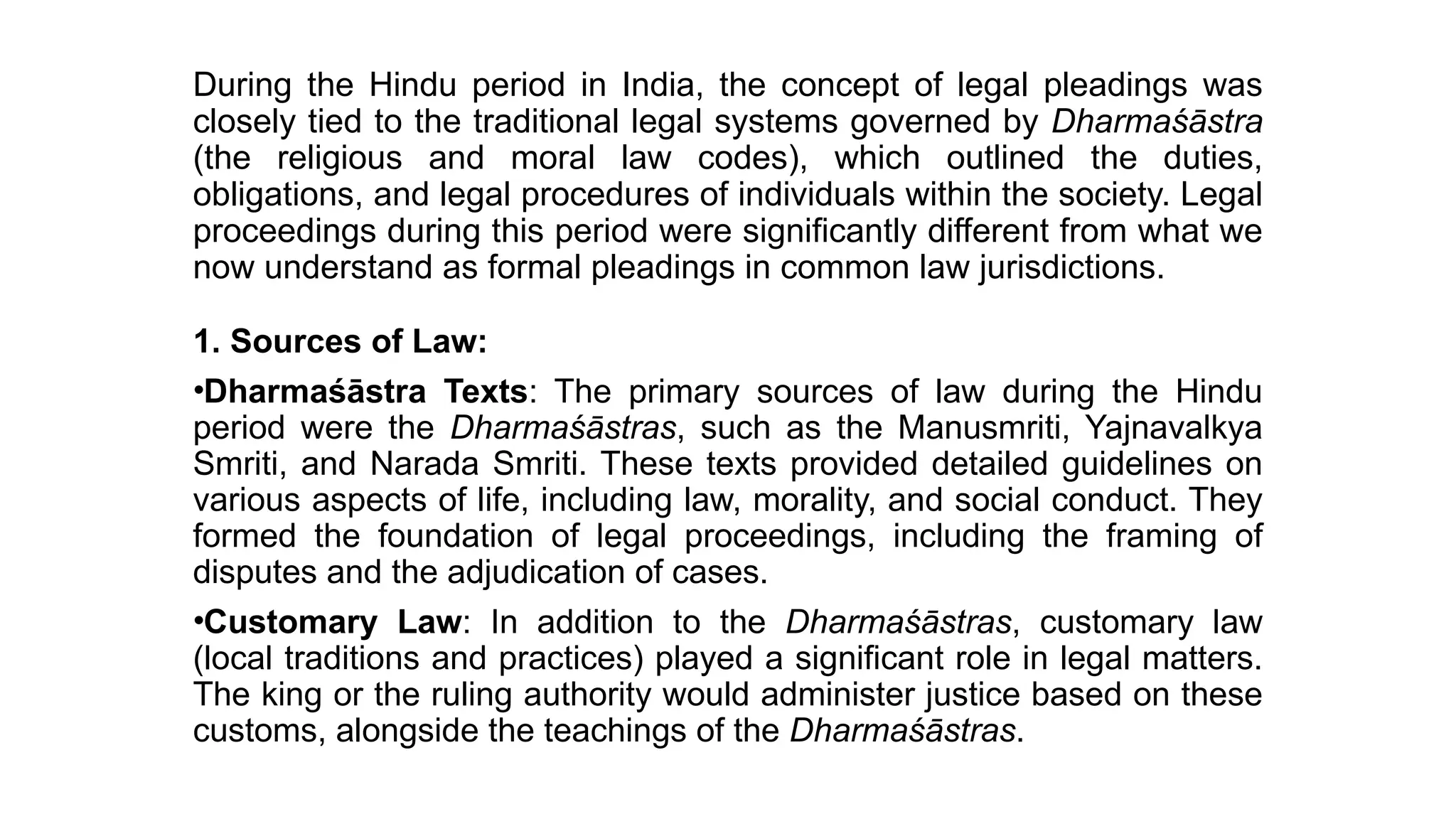 The document outlines the evolution of legal pleadings in India from the Hindu period through medieval England to modern practices. It covers the fundamentals of Hindu legal procedures, the development of common law pleadings in England, and the reforms leading to contemporary pleading systems, including definitions, objectives, and principles governing pleadings as per the Civil Procedure Code in India. The emphasis is on how pleadings structure legal disputes, facilitate trials, ensure justice, and encourage settlements.