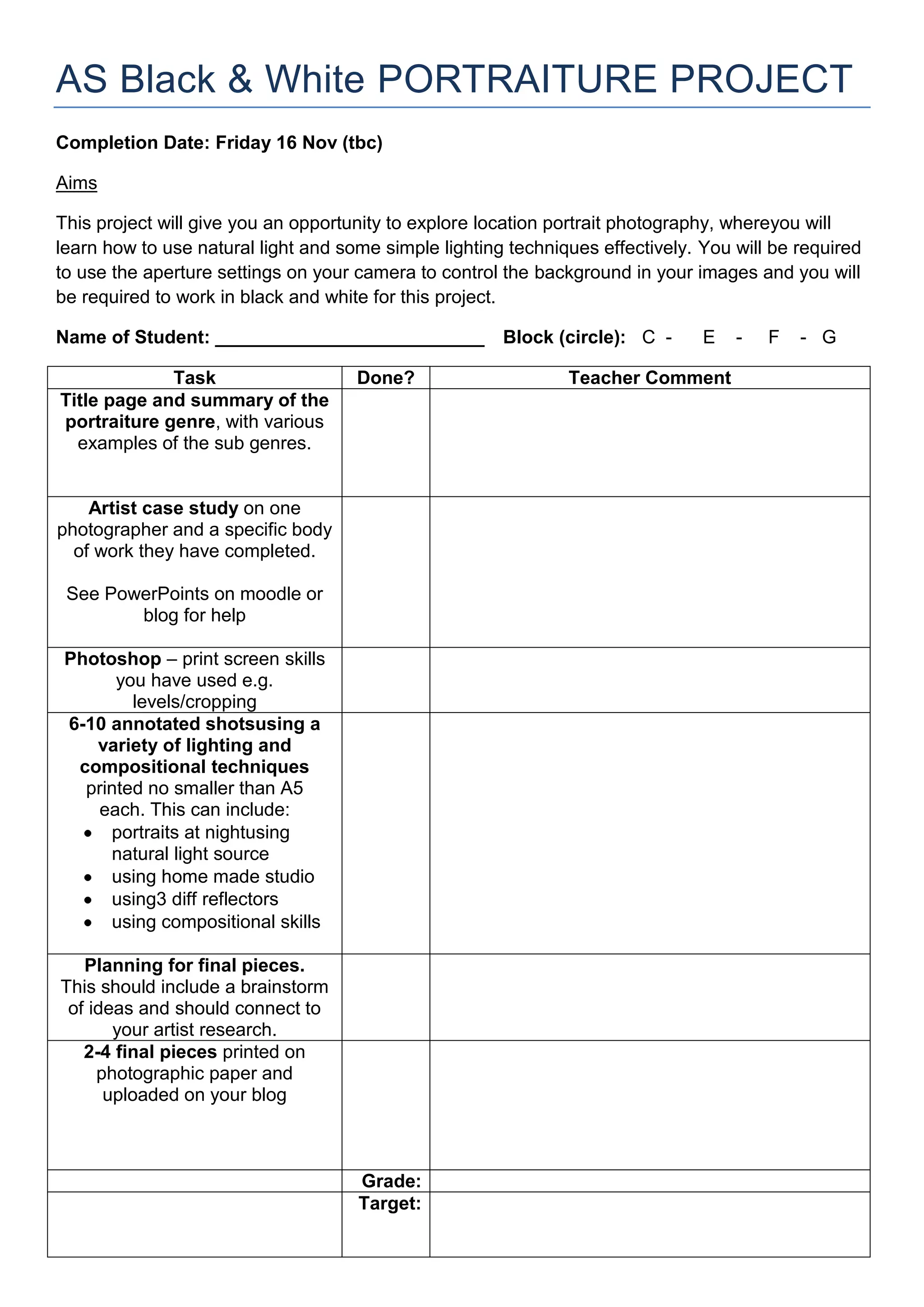 This document outlines a black and white portraiture photography project. Students will learn to use natural light and basic lighting techniques to take portraits on location. They will control the background using aperture settings on their cameras. As part of the project, students must complete a title page and summary of portraiture genres with examples, an artist case study, annotated sample shots using different lighting and compositions, and 2-4 final pieces printed on photographic paper. The deadline for completion is Friday, November 16.