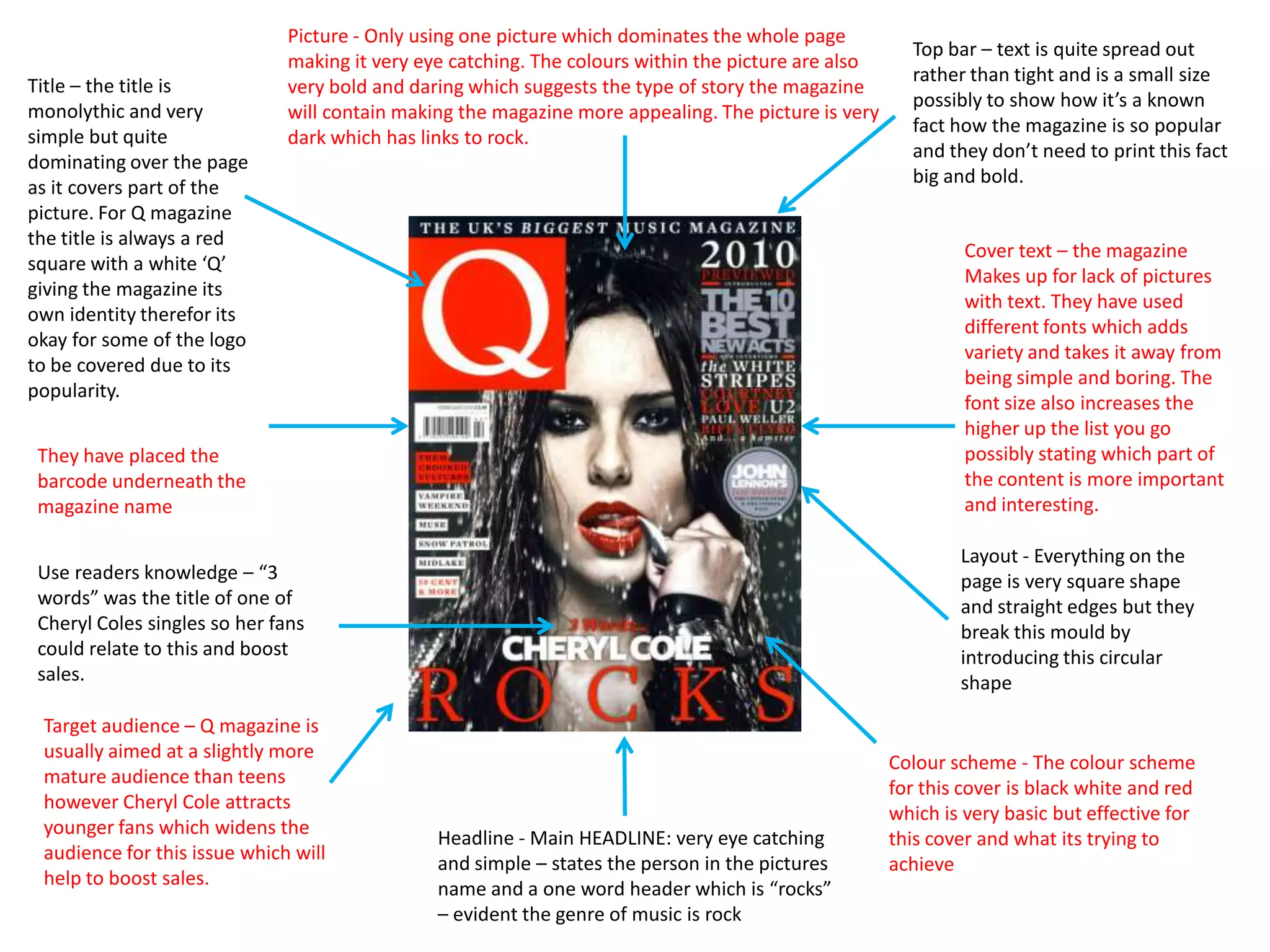 The document analyzes the cover design of a Q magazine featuring Cheryl Cole. It notes several key design elements: