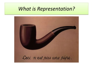 The document discusses various concepts related to representation in media texts including signs, codes, ideologies, and the representation of social groups such as gender, ethnicity, age, sexuality, class, ability, and region. It provides examples of common representations within each social group and questions to consider when analyzing representations, such as whether they reinforce stereotypes or provide diverse portrayals.