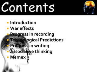 Vannevar Bush's 1945 article described the issues with accessing growing amounts of information and proposed a new machine called Memex to help address this. Memex would allow a user to store books, documents and communications on microfilm and easily retrieve them by clicking between items that were hyperlinked together, mimicking the associative nature of human thought. This visionary concept anticipated key aspects of modern computing such as hypertext, digital libraries and the World Wide Web.