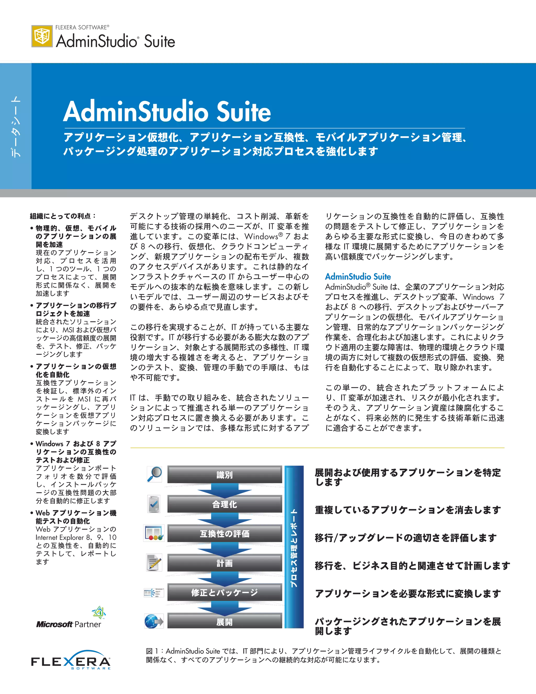などの業界を主導する仮想デスクトップ形式に 自動的に変換します。AdminStudio Virtualization Pack は、複 数のアプリケーション仮想化形式および従来の MSI パッケー ジすべてを 1 つのツールでサポートする、唯一のソリュー ションです。 テストおよび検証 – AdminStudio Virtualization Pack では、 MSI パッケージをカスタマイズ、テスト、検証、編集する機 能が、仮想形式まで拡張されています。このため、パッケー ジング担当者は、従来のパッケージと同じツールおよびプロ セスで、仮想パッケージを管理できます。パッケージの競合 テストおよび検証テストを実施して、パッケージ相互または 他の物理的に展開されたアプリケーションと競合しないこと を確認し、パッケージングの最優良事例に適合していること を確認できます。 App-V に対する広範なサポート – 仮想パックは、Microsoft App-V(App-V 5.0 を含む)に対する広範なサポートを提供 します。アップグレードウィザードにより、App-V 4.5 また は 4.6 から App-V 5.0 への移行が自動化され、新しいツール を学習する必要や、複数の環境やインターフェースを使用す る必要がなくなります。さらに、Virtual Package Editor によ り、App-V パッケージを直接編集できるようになり、App-V パッケージに変更する必要があるとき、MSI から再変換する 必要がなくなります。 仮想化パック(アプリケーション互換性パック付き)に は、Windows 7 および 8 (32 および 64 ビット版)、 Windows Server 2008 R2、Windows Server 2012 アプリケー ションの互換性テストを、直接 App-V 4.5、4.6 およ び 5.0 パッケージで実行する機能が含まれています。その うえ、App-V パッケージを直接 XenApp サーバーに発行し て、VDI およびホストとなる仮想セッションのアプリケーショ ン管理タスクを合理化できます。 サーバーアプリケーション仮想化のサポート – AdminStudio Virtualization Pack は、自動的にサーバーアプリケーション をテストして、Microsoft Server App-V 形式への変換および 展開の適合性を決定します。アプリケーションの問題を分類 して、テストセンターに表示し、同じインターフェースをデ スクトップとサーバーアプリケーションに使用できるように します。 さらに、仮想化パックによって、Microsoft Private Cloud で使 用するための、サーバーアプリケーションの Server App-V 形 式への変換が単純化されます。System Center Virtual Machine Manager (SCVMM) からのオペレーティングシステム画像 を、Microsoft Server App-V パッケージの取り込み用に、セ ットアップできます。SCVMM からのオペレーティングシス テム画像を、アプリケーションの取り込みで使用するために 設定することもできます。AdminStudio は、自動的に Server App-V シーケンサを起動して、シーケンス処理プロセスを開 始することができます。取り込んだ Server App-V パッケー ジを読み出して AdminStudio Application Manager に保存す ることができ、ここで分類してテストすることもできます。 AdminStudio アプリケーション互換性パック AdminStudio アプリケーション互換性パックは、互換性問題 を自動的に評価および修正することにより、Windows 7 およ び 8(いずれも 32 ビットおよび 64 ビット版)、Windows Server 2008 R2 および Windows Server 2012 への移行を加 速します。さらにこれにより、多くの場合 Windows 7 およ び 8 の移行に関係する主要な課題である、Web アプリケー ションを Internet Explorer 8、9、10 に移動する場合の問題 を、迅速に突き止めることができます。 Windows 7 および 8 の互換性評価 – 総合的なレポートによ り、互換性の取り組みのサイズ、コスト、範囲への洞察が得 られます。互換性評価に必要な時間は、週単位ではなく、分 単位です。Windows 7 および 8 の互換性に関する何千もの 自動確認により、このソリューションにより、使用するアプ リケーションのポートフォリオ全体を一目で表示できます。 その結果、どのアプリケーションに修正が必要かを、すばや く理解できます。この可視性により、移行のタイムスケール とコストに関連する意思決定が強化されます。 アプリケーション互換性問題の詳細レポート – ダッシュボー ドおよびレポートにより、AdminStudio カタログまたはグ ループごとの、すべてのアプリケーションに関する複数の観 点からの全般的互換性ステータスが提供されます。掘り下げ ることにより、全体像から詳細分析までが得られます。監査 証跡レポートに、テストおよび修正の時系列的進捗が表示さ れ、プロジェクトチームに貴重な洞察をもたらします。 自動化された Windows 7 および 8 アプリケーション互換性 修正 – AdminStudio アプリケーション互換性パックは、イン ストールパッケージ関連のアプリケーション互換性問題の 98% 以上を自動的に修正できます。わずか数分間で、アプ リケーションの修正に適用できる標準 MSI 変換が、自動的に 生成されます。これにより、Windows 7 および 8 への移行 の、迅速で一貫した高品質の取り組みが保証され、パッケー ジングおよび