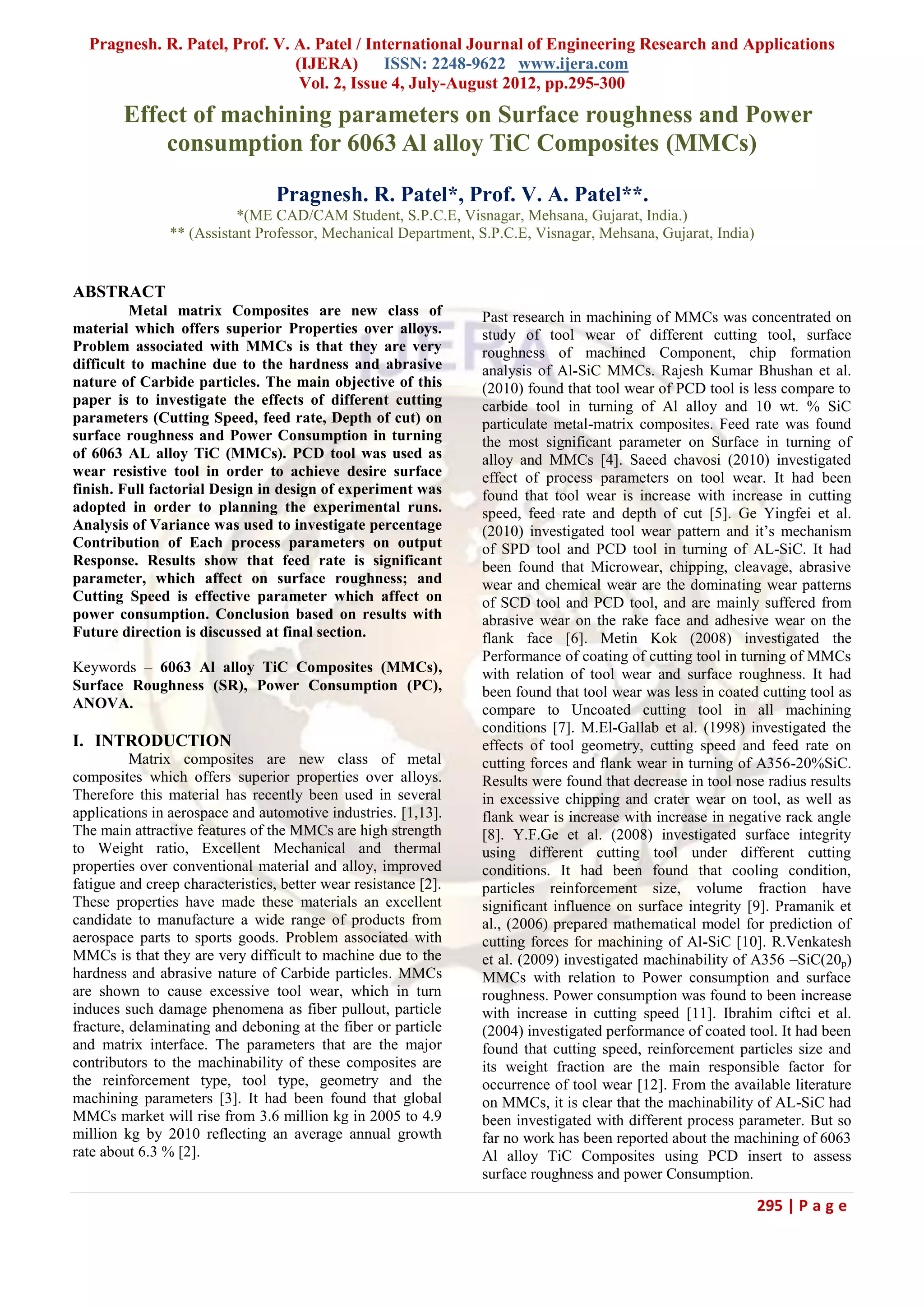 The document summarizes a study that investigated the effects of cutting speed, feed rate, and depth of cut on surface roughness and power consumption when turning 6063 aluminum alloy reinforced with 5% and 10% titanium carbide composites. 27 experimental runs were conducted using a full factorial design varying the machining parameters at three levels. Analysis of variance was used to determine the percentage contribution of each parameter on surface roughness and power consumption. The results showed that feed rate is the most significant parameter affecting surface roughness, while cutting speed has the greatest effect on power consumption. The conclusions provide insights on optimizing the machining parameters to minimize surface roughness and power usage during machining of these metal matrix composites.