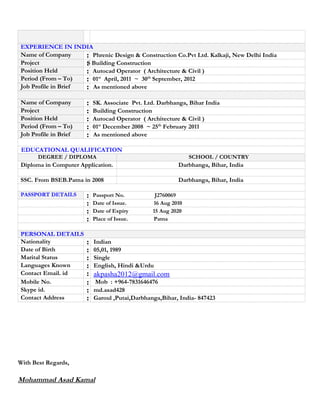 This document provides a summary of Mohammad Asad Kamal's work experience and qualifications. It details his experience as an AutoCAD operator for various construction companies in India, Libya, and Iraq from 2008 to present. It lists his educational qualifications including a diploma in AutoCAD and SSC from BSEB Patna in 2008. Personal details including his date of birth, nationality, languages, and contact information are also provided.