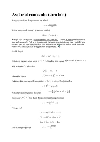 Dokumen ini membahas pembuktian asal usul rumus abc (kecap) untuk mencari akar persamaan kuadrat ax² + bx + c = 0 dengan metode yang berbeda menggunakan integral. Selain menjelaskan diskriminan sebagai faktor menentukan jumlah dan tipe akar, penulis juga menguraikan langkah-langkah penurunan rumus tersebut. Penjelasan ini memberikan perspektif baru terkait cara memperoleh rumus kacap dalam menyelesaikan persamaan kuadrat.