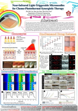 This study developed doxorubicin-loaded microneedles that melt and release the drug upon exposure to near-infrared light, combining chemotherapy and photothermal therapy. The microneedles contain photothermal nanoparticles that generate heat from near-infrared light to quickly melt the microneedles and release doxorubicin into punctured tissue in an on-demand, controlled manner. In vivo tests in mice showed the combined treatment had a synergistic effect, completely destroying tumors without weight loss or tumor recurrence, demonstrating these light-triggerable microneedles are a promising system for superficial cancer treatment.