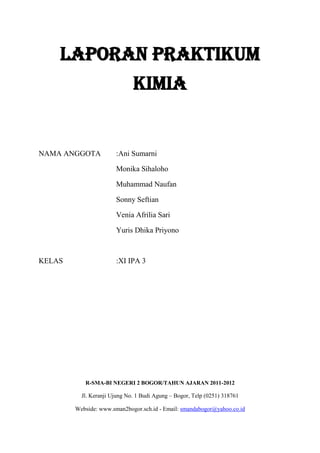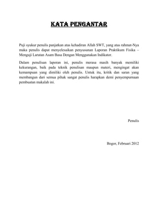 Laporan praktikum ini membahas hasil eksperimen menguji larutan asam dan basa menggunakan berbagai indikator alami. Indikator yang baik, seperti ekstrak bunga sepatu dan bougenvile, menunjukkan perbedaan warna yang jelas antara larutan asam (HCl) dan basa (NaOH), sedangkan ekstrak bunga alamanda dan soka kurang efektif. Kesimpulan menyoroti potensi penggunaan beberapa ekstrak bunga sebagai indikator asam-basa dalam praktikum kimia.