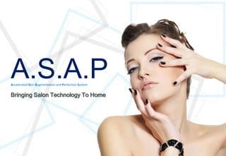 The document describes the A.S.A.P skincare system, which aims to bring salon-level skincare treatments into the home. It provides before-and-after case studies showing the system providing instant results like smoother skin, fewer wrinkles and lifted features within 3 days. The system claims to work through the synergistic effects of plant and fruit extracts to both accelerate inner skin processes and perfect the outer appearance. It is certified as containing no heavy metals or alcohol and being suitable for all skin types. Testimonials praise its effectiveness and recommend it as an alternative to expensive salon treatments.