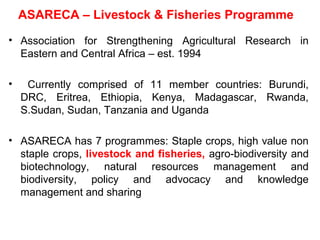 - The document discusses the Association for Strengthening Agricultural Research in Eastern and Central Africa (ASARECA), which has 11 member countries and 7 programs including a Livestock and Fisheries Programme.