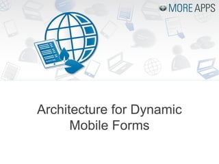 The document describes an architecture for developing dynamic mobile forms using a single code base across platforms and devices. It involves generating HTML, JavaScript and CSS in the cloud and either retrieving that code onto mobile devices or allowing offline usage. The cloud component includes an application builder, version control, storage of application metadata, HTML and mobile data. It also handles deployment of applications, API connectors, email and retrieving application code onto mobile devices.