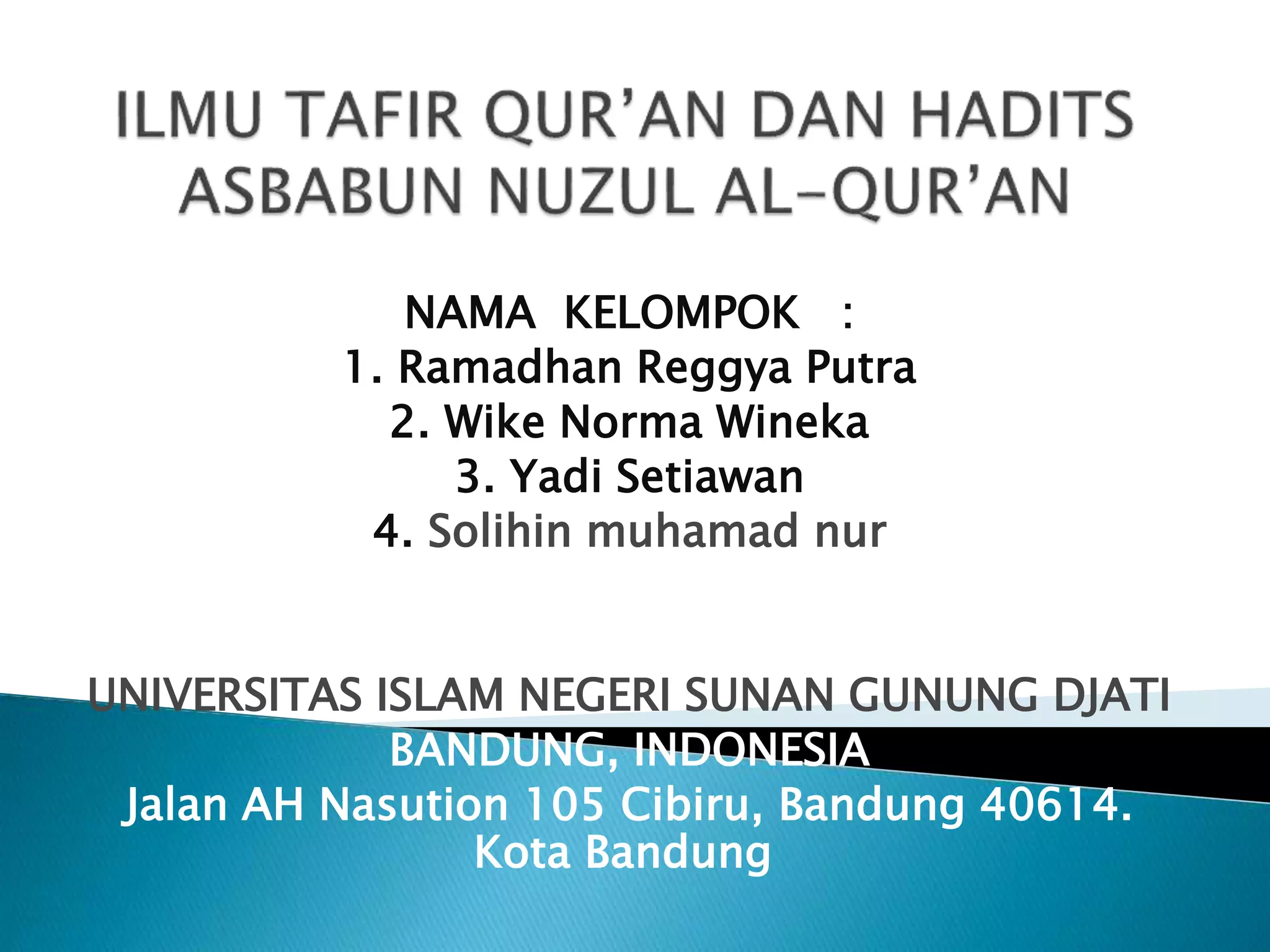 Dokumen tersebut membahas tentang konsep asbab al-nuzul yaitu sebab-sebab turunnya ayat-ayat Al-Qur'an kepada Nabi Muhammad. Asbab al-nuzul dapat dibagi menjadi dua kelompok yakni ayat yang sebab turunnya harus diketahui untuk penetapan hukum yang tepat, dan ayat yang sebab turunnya tidak harus diketahui seperti ayat-ayat kisah. Ayat dapat turun sebagai reaksi ter