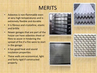 This document discusses asbestos cement partition walls. Asbestos cement sheets or galvanized sheets are used to construct temporary partition walls by fixing them to wooden or steel frames. For higher quality walls, specially manufactured asbestos cement slabs with a corrugated core and plain cement sheets on both sides are used. Asbestos cement is durable, flexible, fire resistant and provides insulation. However, asbestos poses health risks if fibers are released and inhaled when damaged. The document also discusses corrosion issues with galvanized iron partitions and methods to prevent corrosion.