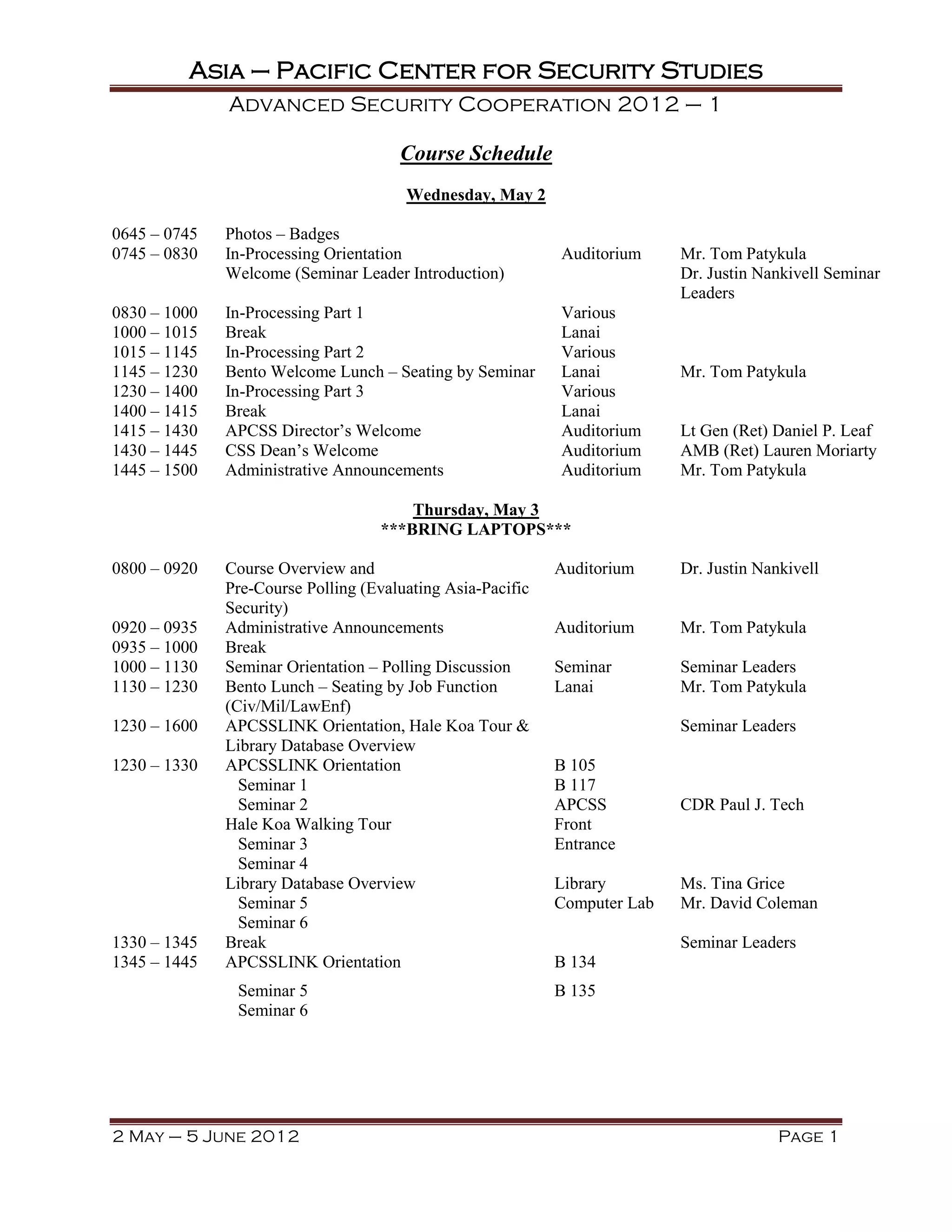 This document provides the course schedule for the Asia-Pacific Center for Security Studies Advanced Security Cooperation seminar from May 2 to June 5, 2012. The schedule outlines the daily activities, topics, presenters and locations for lectures, seminar discussions, group projects, case study research, and cultural excursions. The course is divided into three modules covering cooperation and complexity, internal security, and major powers in the Asia-Pacific region.