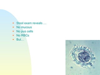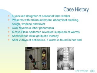 A 6-year-old girl presented with malnourishment, abdominal swelling, cough, wheeze and fever. Imaging revealed lobar pneumonia and suspicion of worms. Stool examination found Ascaris lumbricoides eggs. Ascaris lumbricoides is an intestinal roundworm that infects over 1 billion people worldwide. It is transmitted through ingestion of eggs from contaminated food, water or soil.