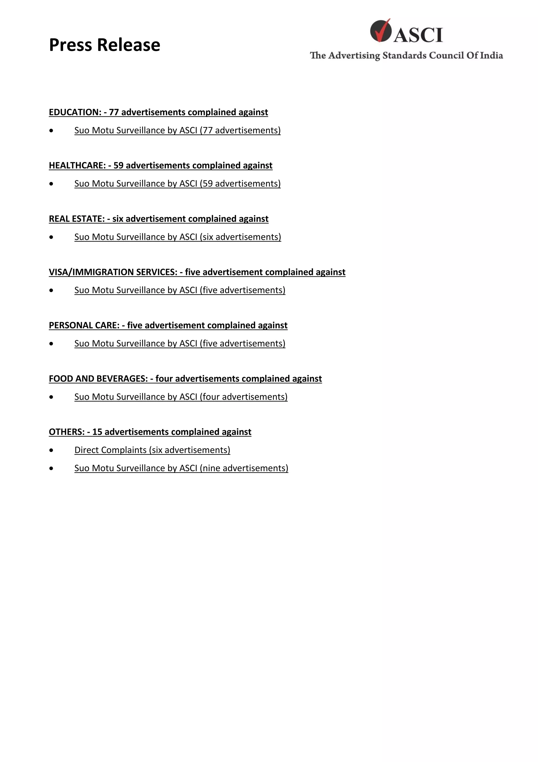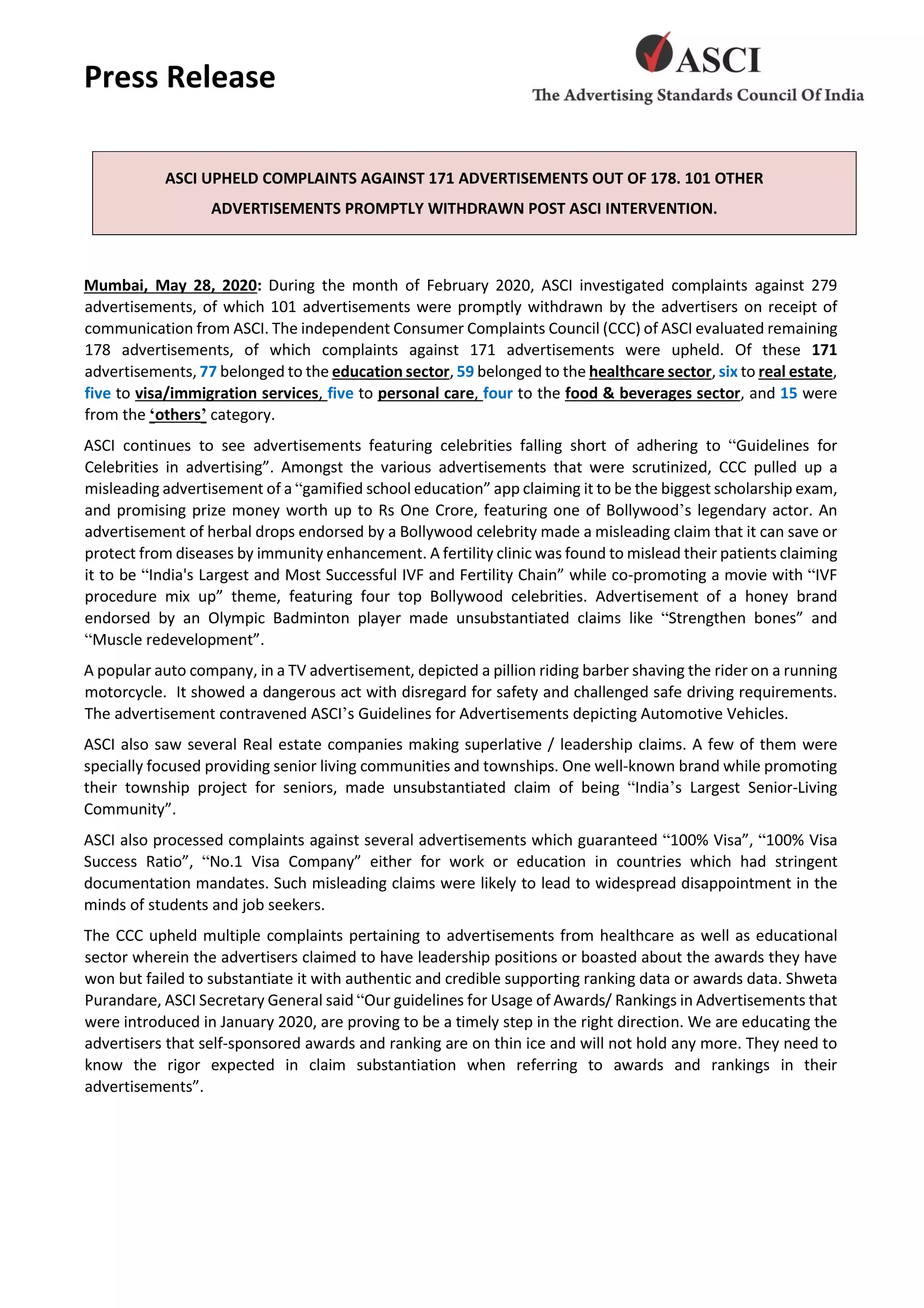 The ASCI investigated complaints against 279 advertisements in February 2020. Of these, 101 advertisements were withdrawn by advertisers. The remaining 178 advertisements were evaluated, and complaints against 171 were upheld. The majority of upheld complaints were in the education (77) and healthcare (59) sectors. Several advertisements made misleading claims about leadership positions or awards that were not adequately substantiated. Celebrity endorsements also failed to adhere to guidelines. Dangerous acts were depicted that could encourage unsafe behavior. The ASCI continues to educate advertisers on properly substantiating claims and following guidelines.
