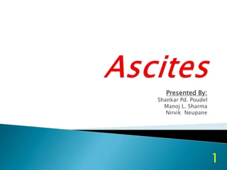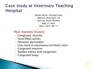 This document discusses ascites in broiler chickens. It describes a case of ascites in a 21-day-old broiler, noting post-mortem lesions including congested muscles, fluid-filled cavities, and congested organs. Treatments including medications to support liver and kidney function were prescribed, along with advice to improve ventilation by opening curtains and changing litter. Ascites is defined as an abnormal collection of fluid in the abdominal cavity, which can result from heart or organ disease. Common causes in broilers are identified as high altitude, heat stress, and respiratory illnesses.