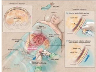The document discusses the analysis of ascitic fluid, which is abnormal fluid accumulation in the abdomen. Key points: