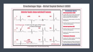 This document provides an overview of atrial septal defects (ASD), including definitions, types, development, associated conditions, clinical presentation, investigations, and treatment. The main types of ASD are fossa ovalis/ostium secundum, sinus venosus, and ostium primum defects. Clinical features may include fatigue, breathlessness, and arrhythmias. Investigations include chest X-ray, echocardiogram, and cardiac catheterization. Large defects or those causing heart failure or pulmonary hypertension typically warrant surgical closure to repair the septal defect. The surgery aims to close the defect without causing heart block or valve problems.