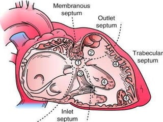 The document discusses non-surgical interventions for atrial septal defects (ASDs) and ventricular septal defects (VSDs). It describes the anatomy, causes, symptoms, and types of ASDs and VSDs. It provides indications for intervention such as large defect size, heart failure, or failure to thrive. The main non-surgical interventions discussed are percutaneous device closure of ASDs and VSDs, which are preferred to surgery when the anatomy is suitable. The future of interventions may include improved 3D imaging, contrast agents, and stents to repair more complex congenital heart defects.