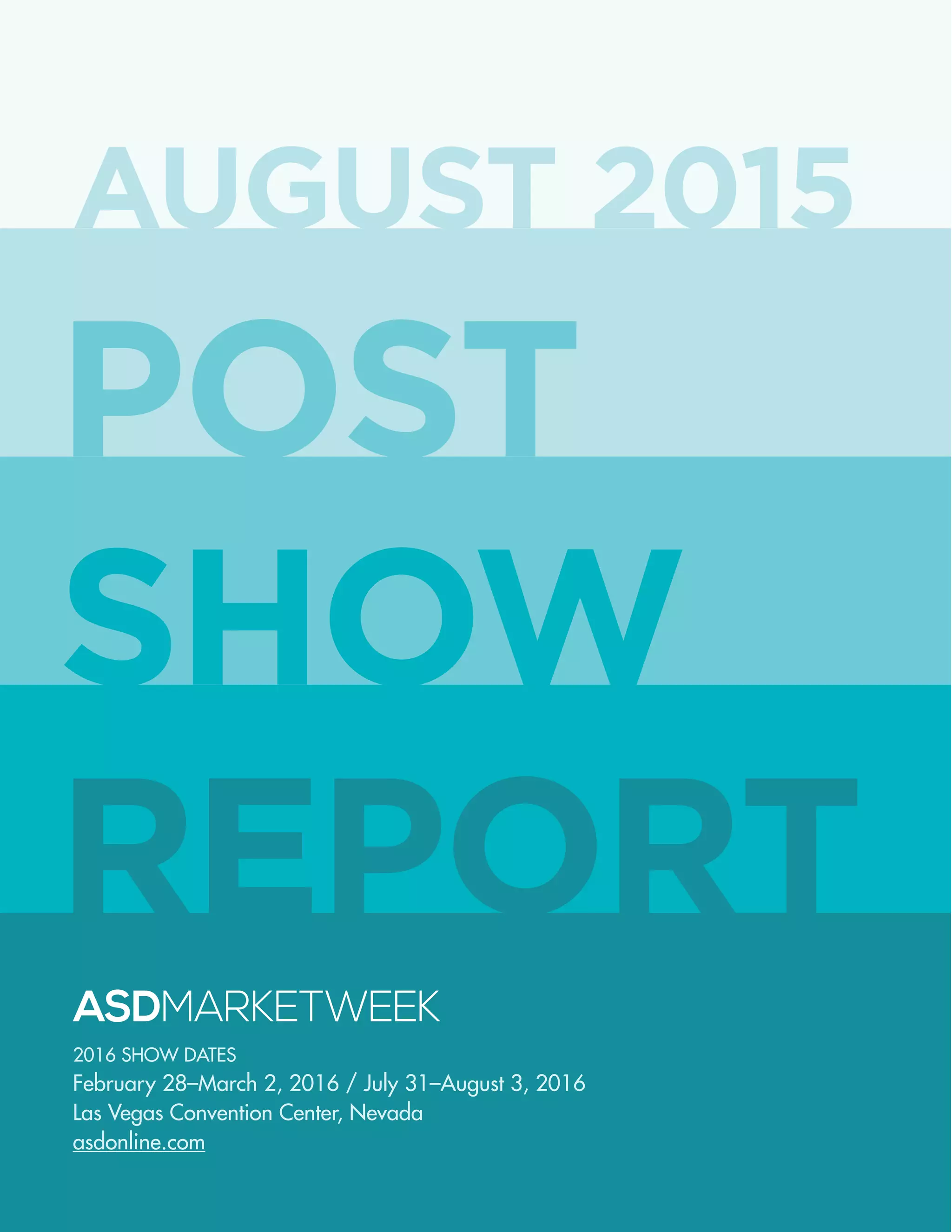 The August 2015 post-show report for ASD Market Week highlights significant growth in buyer attendance, with a 24% increase in VIP buyers and 14% overall, alongside 28% of attendees being new to the event. The rebranding to reflect a vibrant shopping destination aimed to attract a broader range of buyers by showcasing various market categories. The report also notes a substantial marketing investment of over one million dollars to enhance buyer quality and connections, leading to record sales for many exhibitors.