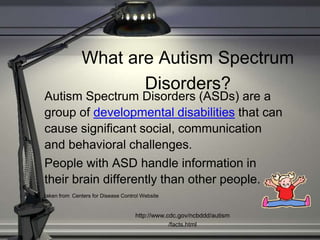 This document provides an overview of autism spectrum disorders (ASD) including what they are, who they affect, common signs and symptoms, potential causes, and implications for students and teachers. Some key points: ASD is a developmental disability causing social, communication and behavioral challenges. It affects each person differently, from mild to severe. Boys are more likely to be affected. Teachers should understand ASD to help students be successful by maintaining routines, using visual supports, and getting help from special education staff. The goal is for students with ASD to be educated inclusively whenever possible.